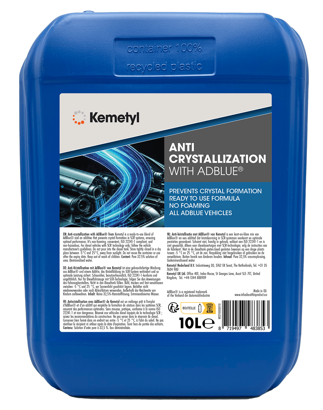 Protect your Selective Catalytic Reduction (SCR) system with Kemetyl Anti Crystallization, the ultimate solution for keeping your AdBlue® system running smoothly. Specially formulated to prevent crystal formation even at temperatures as low as -10°C, this ready-to-use product ensures optimal performance of your SCR system while extending the lifespan of your vehicle components. By effectively preventing urea crystal build-up, it helps avoid clogging and enhances the conversion of urea into ammonia, resulting in more efficient reduction of nitrogen oxides (NOx). Kemetyl Anti Crystallization also protects against corrosion, safeguarding critical components such as pumps and injectors, and maintaining clean exhaust pathways, which can indirectly contribute to better fuel economy. Suitable for all diesel engines equipped with AdBlue® systems, application is simple: just pour the product into the AdBlue® tank, where it mixes easily and begins working immediately. Fully compatible with AdBlue®, it leaves no combustion residues and causes no harm to filters or catalysts, ensuring your SCR system operates at peak efficiency for longer.